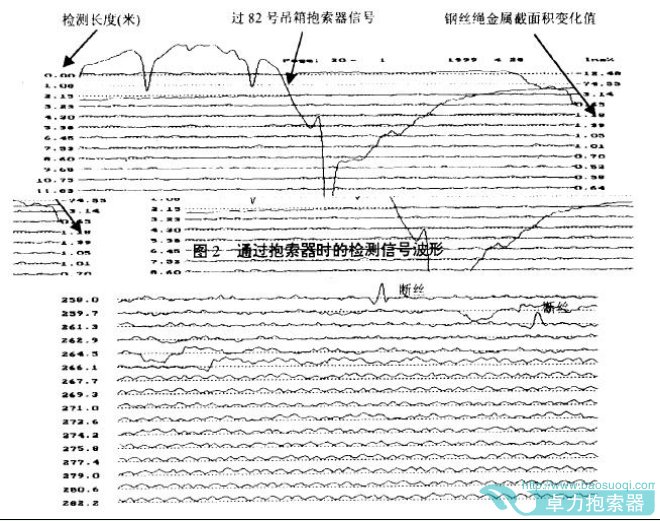 另一種檢測方法如上述第3節(jié)的檢測方法,這樣可以減少拆裝傳感器時(shí)間,提高檢測效率。但由于該類型索道的抱索器與固定抱索器有所不同,在進(jìn)行傳感器結(jié)構(gòu)設(shè)計(jì)時(shí)要注意這一點(diǎn)。不管采取何種檢測方法,與固定抱索器索道鋼絲繩檢測一樣,要在吊廂組移動(dòng)前后,分別進(jìn)行一次檢測,以保證整鋼的無漏檢測。圖3是杭州北高峰索道檢測的信號(hào)波形。