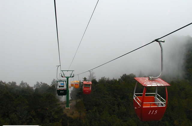 這種索道的工作原理是:一條無極鋼絲繩套在兩端的驅(qū)動輪及迂回輪上,線路中間設(shè)有支架,其上裝有托索輪組或壓索輪組,依地勢變化將鋼絲繩托起或壓下。將吊椅(吊廂、吊籃)用固定抱索器等距離掛結(jié)在鋼絲繩上,驅(qū)動輪帶動鋼絲繩運轉(zhuǎn),將吊椅(吊廂、吊籃)由起點帶到終點,經(jīng)迂回輪到另一側(cè)后又回到起點,如此循環(huán),實現(xiàn)運送游客的目的。這種索道的特點是結(jié)構(gòu)簡單、價格低廉、維護方便、目前是國內(nèi)使用最多的一種。